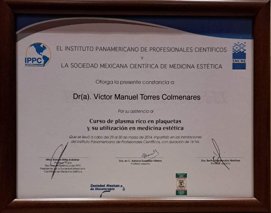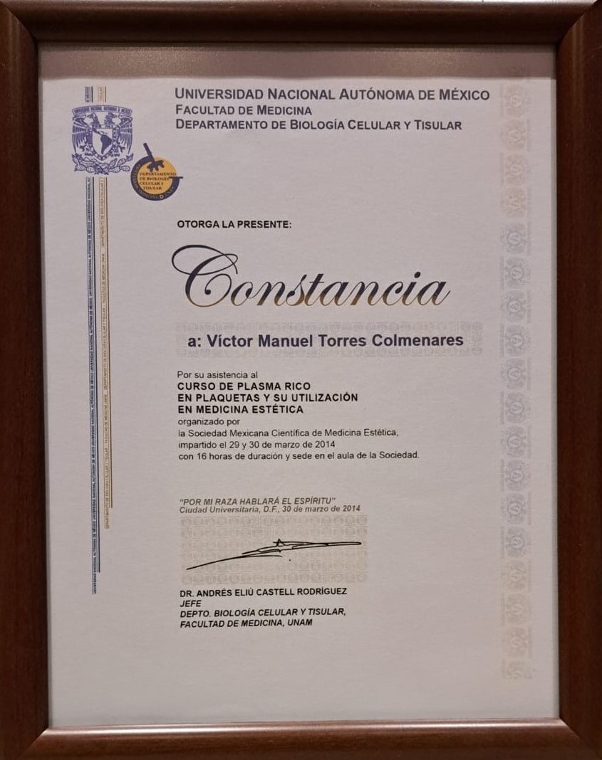 Constancia en curso de plasma en plaquetas, y su uso en medicina estética. - Facultad de Medicina de la UNAM, el día 29 y 30 de Marzo del 2014